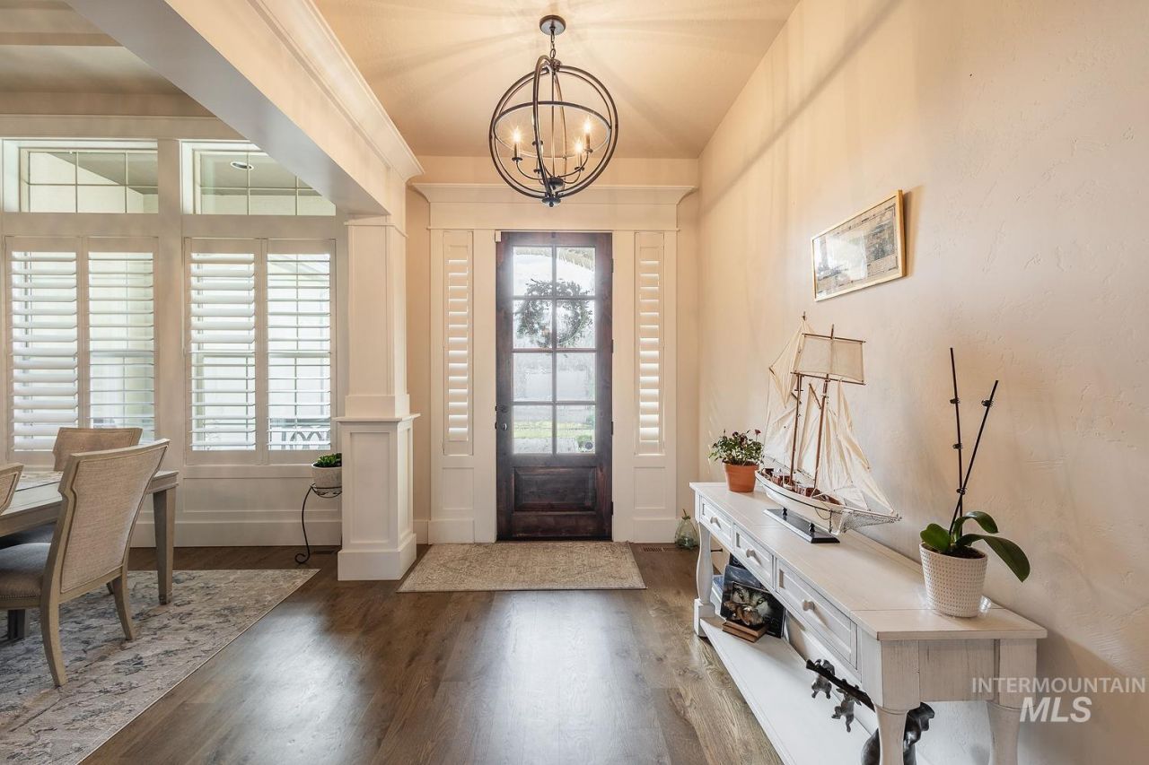 Experience refined living in this impeccably maintained James Clyde 4-bedroom, 3.5-bath home, ideally situated on a quiet interior street in Eagles highly sought-after Homestead community. In addition to the four bedrooms, a large dedicated office with French doors offers flexible space. Designed for everyday comfort and elevated entertaining, this thoughtfully crafted residence showcases timeless architectural detail and quality construction rarely found. Warm wood flooring flows through the main living areas, leading to an inviting great room with vaulted, beam-accented ceilings that create an open yet intimate feel. Updated luxury vinyl plank enhances the remainder of the home. Two dining areas include a paneled formal dining room and an informal dining space adjacent to the kitchen. The gourmet kitchen features premium Thermador appliances, abundant cabinetry, generous prep space, and an oversized walk-in pantry with built-in outlets?ideal for a coffee station or small appliances. Custom trim, designer lighting, and distinctive finishes add character throughout. The primary suite offers a peaceful retreat with a spa-inspired bath and separation from additional bedrooms and office. Guest suite includes en-suite bath; secondary bedrooms share a Jack and Jill bath. Enjoy .302 acres of landscaped grounds with a year-round water feature, full fencing, large patio- 3 car garage!