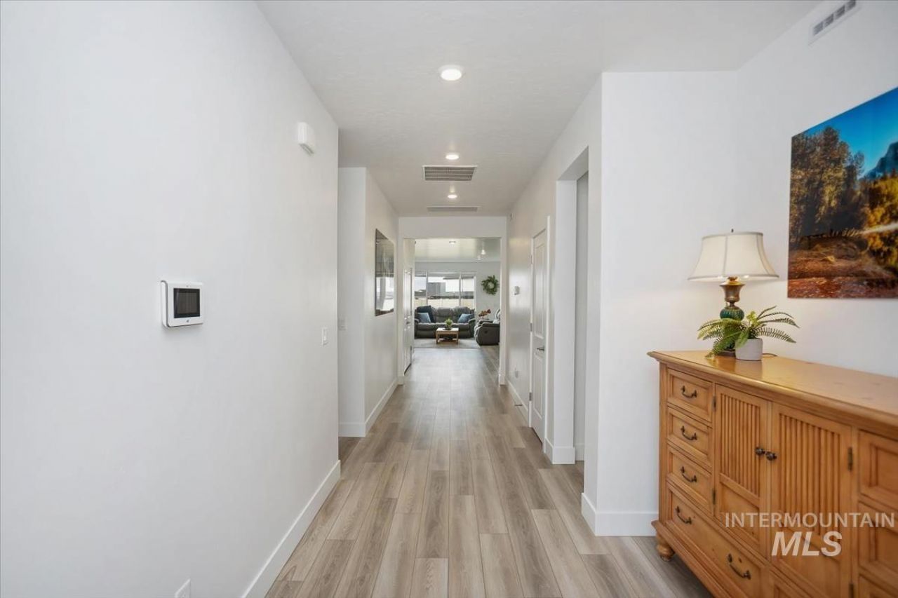 RV Bay seekers look no further! Situated on a large lot in the Terrace Falls Sub of South Nampa, a storage shed has already been built as well as overhead garage storage to keep all 1332sf of that beautiful garage space open for your toys! This home looks brand new and has been meticulously cared for. Split bedroom design keeps secondary bedrooms + the flex room off the main hallway, while the primary suite is tucked in the back for privacy where you can enjoy the walk-in closet, enclosed shower, large soaker tub and dual-vanity en-suite. Main living area has large windows, a feature wall perfect for display, & includes built-in gas fireplace with ample space for the whole family to gather. Vinyl plank flooring flows seamlessly throughout the whole house, as does the air you breathe because in addition to 9 ceilings throughout and the already energy efficient system that includes a conditioned crawl space, seller has had a whole house ventilation fan installed for additional energy savings. Enjoy gathering around the large quartz countertop island in the kitchen & preparing meals at the comfortable 36 cabinetry height with soft-close feature. Built-in double-ovens, gas range, microwave, and double-door pantry make this kitchen a dream to work in. Dining area opens through 8x8 sliding door to the covered patio and spacious, fully fenced back yard with pressurized irrigation.