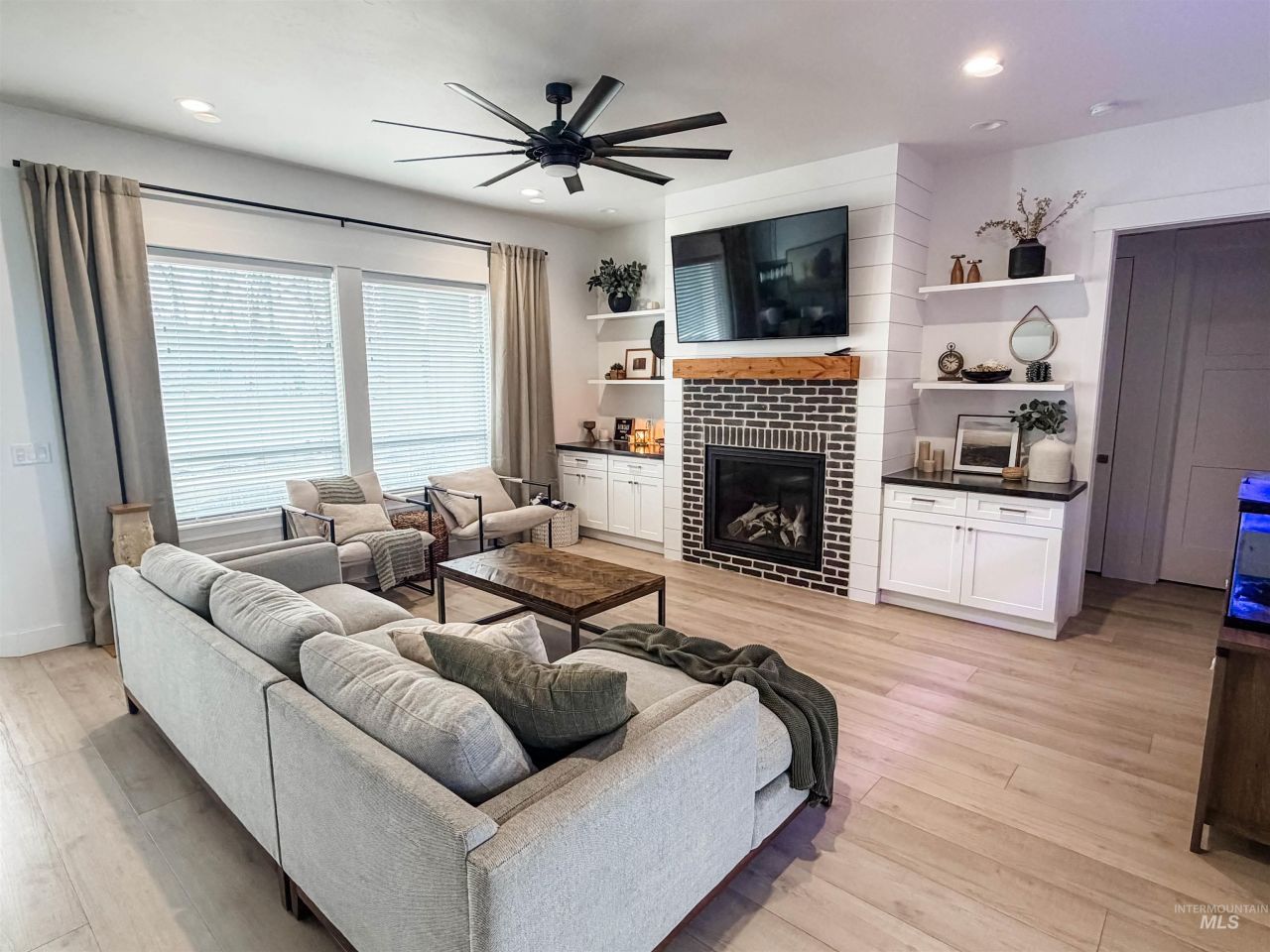 Welcome to modern luxury in the sought-after Modena subdivision! This custom-built, single-level 3 bedroom 2.5 bath home is situated on a large corner lot and offers a perfect blend of style and comfort. The home features modern flooring, stunning light fixtures, 10 ceiling, custom cabinets and custom cabinetry throughout. Every room boasts ample natural light, creating a warm and inviting atmosphere. The spacious living room, complete with a cozy gas fireplace, built in vacuum system, cabinets and shelving, flows seamlessly into the designer kitchen, featuring a 8-foot island, a oversized walk-in butler style pantry, tile backsplash, built in lower level microwave and a wine refrigerator. The relaxing primary suite is a true retreat with a beautiful soaker tub, natural light, built in shower with glass surround and a large walk-in closet with built in drawers. Two additional bedrooms, a full bath and a half bath provides ample space. Enjoy outdoor living with a spacious covered front porch, back covered patio, fully vinyl fenced yard, and automated sprinkler system. The home also boasts a spacious 3-car garage with a 220v outlet. Ideally located near freeway access, dining, shopping, schools, and more. Welcome home!